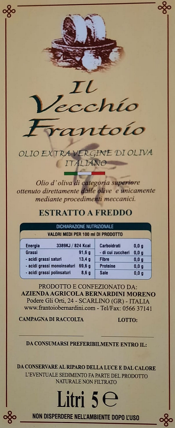 L’Azienda Agricola Il Vecchio Frantoio è situata ai piedi di Monte d’Alma (su cui si erge la cittadina di Scarlino), sul versante Nord della Provincia di Grosseto, nel cuore dell’Alta Maremma Toscana. Coltivata ad Olivo da tre generazioni, rappresenta un’ azienda storica della produzione di Olio Extravergine in Maremma con oltre 40 anni di esperienza. Si estende per circa 30 ettari di terreno, suddivisi in due appezzamenti separati, uno nel comune di Scarlino e l’ altro nel comune di Gavorrano tutti interamente coltivati ad Oliveto con 22 Cultivar presenti. L’ estesa superficie olivetata in passato avrebbe creato problemi per i lunghi tempi di raccolta a mano che si sarebbero protratti anche per mesi, non garantendo omogeneità del prodotto finale ed anche dubbia qualità soprattutto se si fosse affidata la frangitura delle olive ad un frantoio di terzi che avrebbe franto dopo qualche giorno. L’importanza di avere l’ intera filiera di produzione dalla cura delle piante all’ imbottigliamento finale dell’ olio ha fatto si che circa 30 anni fa, si costruisse all’ interno dell’ azienda un Frantoio proprio (che oggi frange anche per terzi), sulle orme di un frantoio secolare ormai dismesso che risiedeva nel podere vicino. Per garantire il massimo della qualità dell’olio c'è bisogno che le olive siano sane, raccolte a metà maturazione dalla pianta e frante immediatamente, quindi oltre al frantoio privato col passare degli anni si sono affiancati agli oliveti secolari, nuovi moderni sistemi di coltivazione ad alta densità che permettono una raccolta meccanizzata in continuo utile ad accorciare i tempi critici tra raccolta e frangitura ottenendo così un prodotto omogeneo, da una produzione di oltre duemila quintali di olive annue, riuscendo ad “imbottigliare”, insieme all’ olio, tutti i profumi ed i sapori freschi di raccolta.